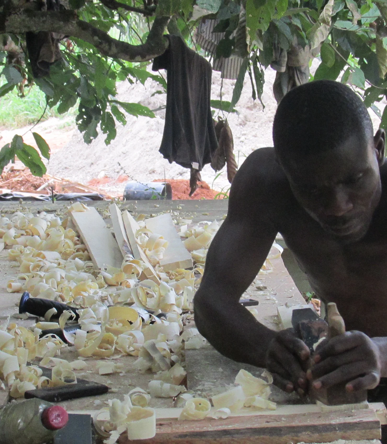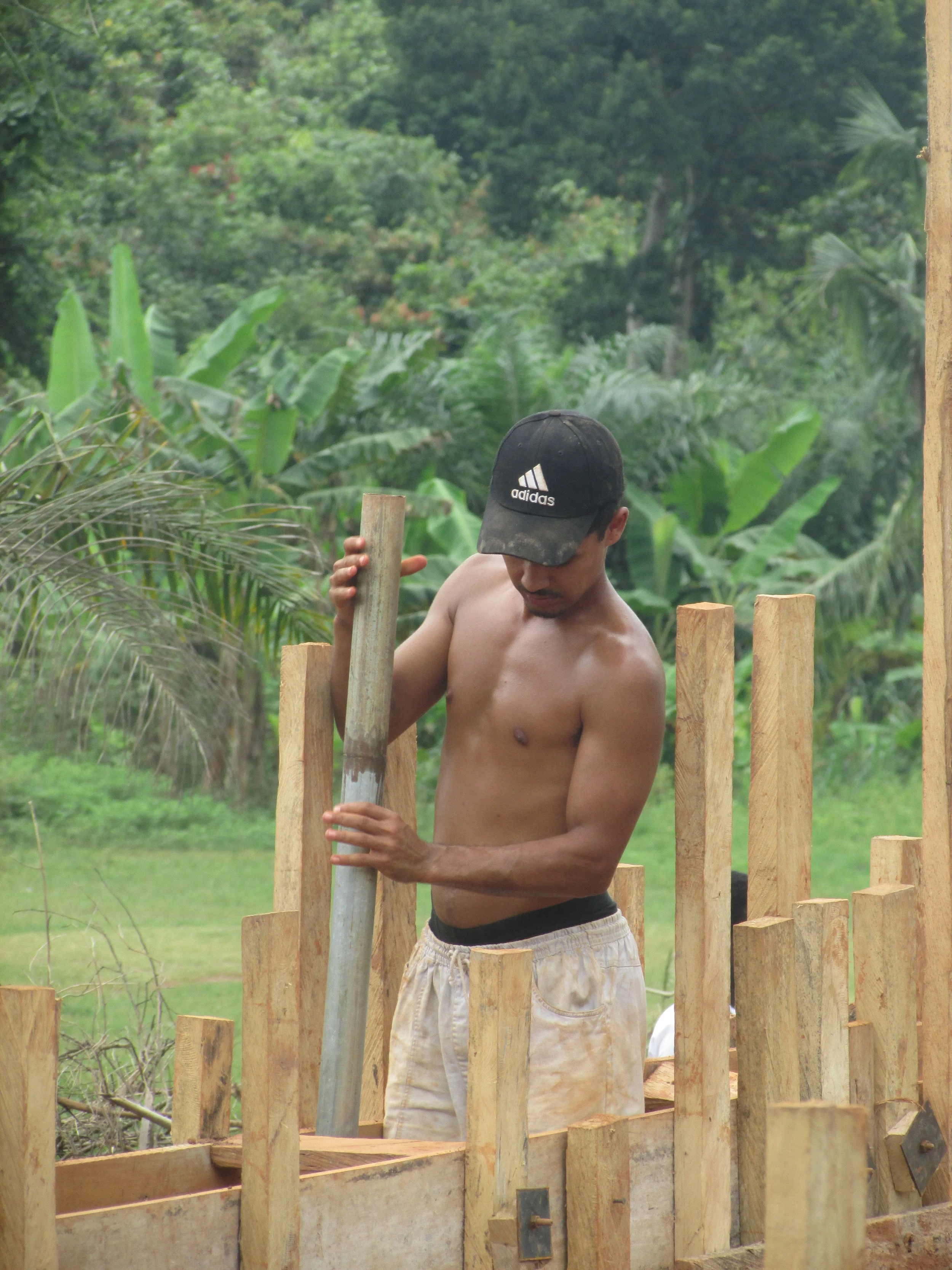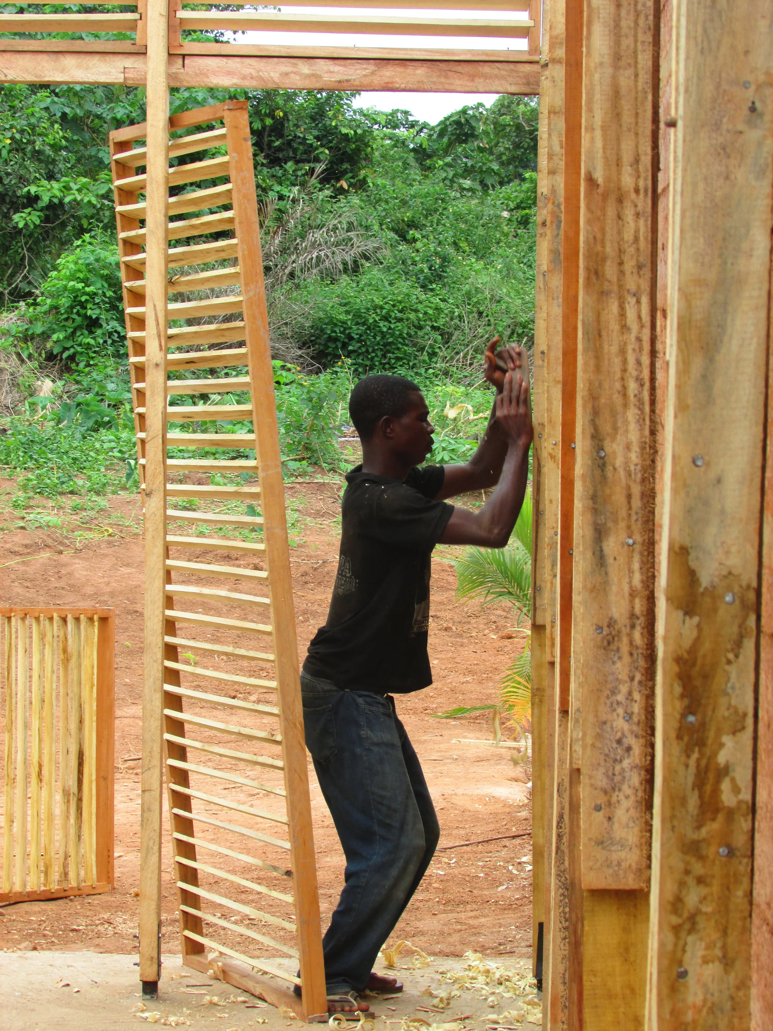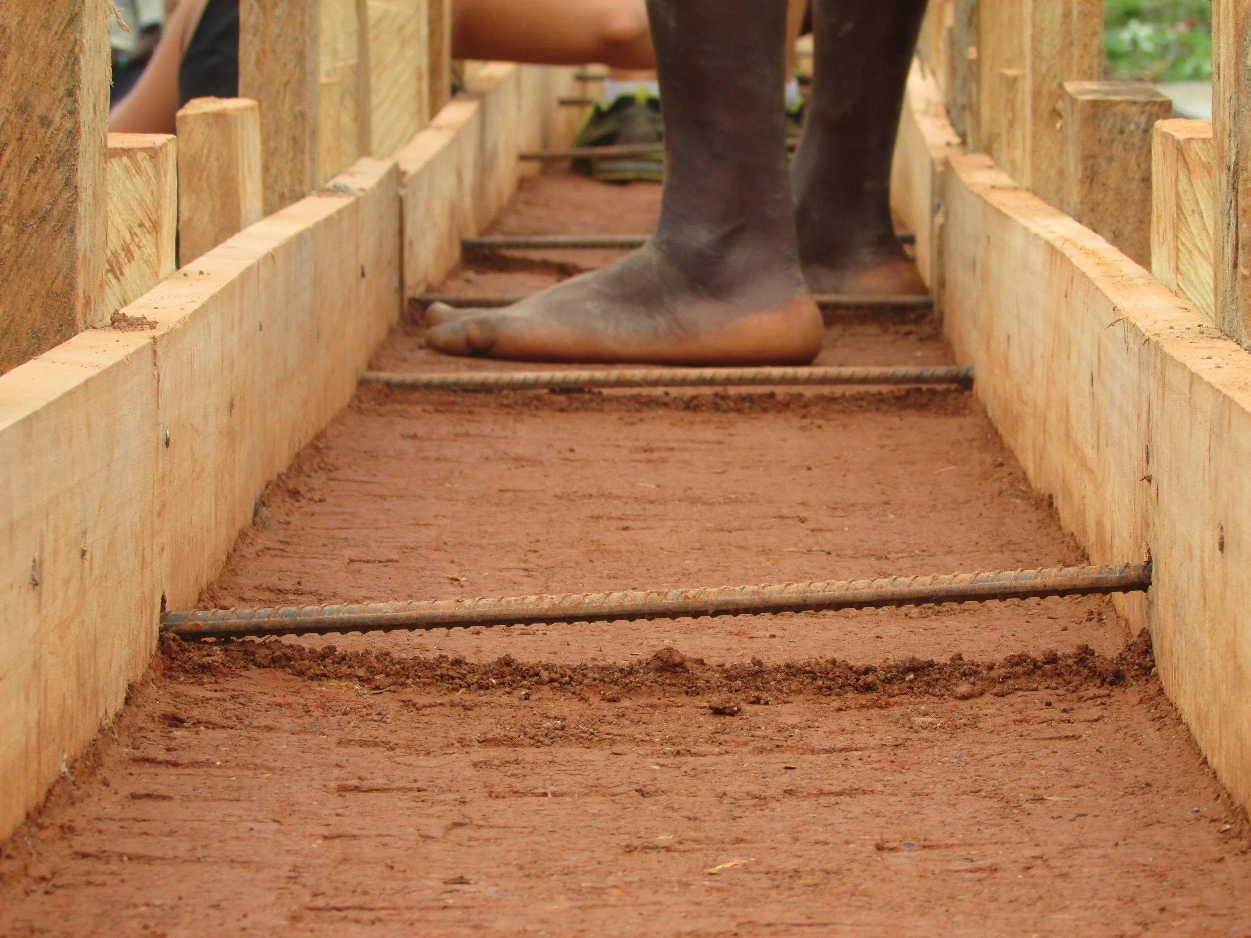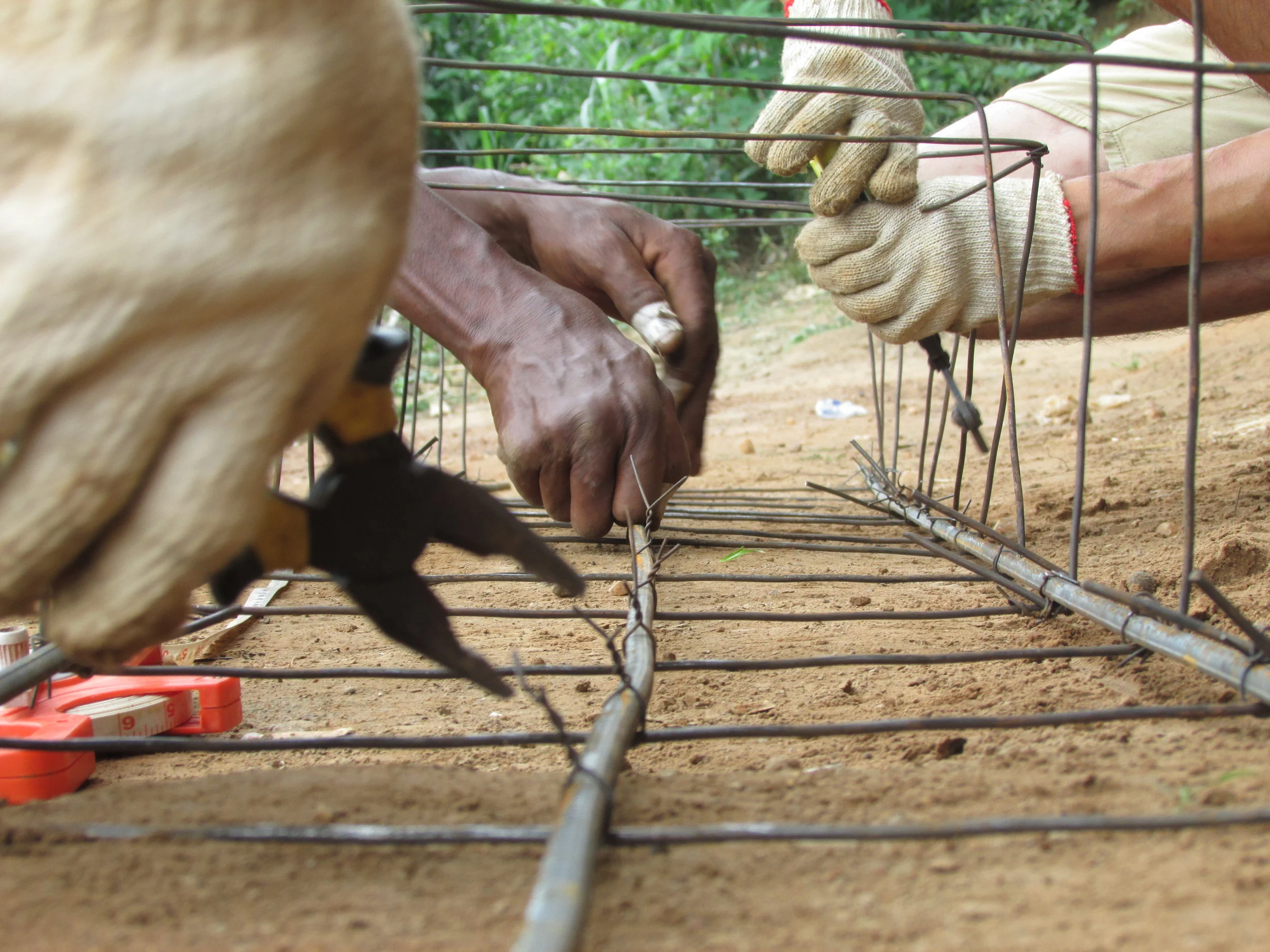 Since no electricity was available it was built by hand. Materials available on site (earth, wood and vegetation) were utilized to build. Mainly earth and wood was used resulting in moving by hand 58 000 kg of soil and planing 3km of wood with 2 hand planers.