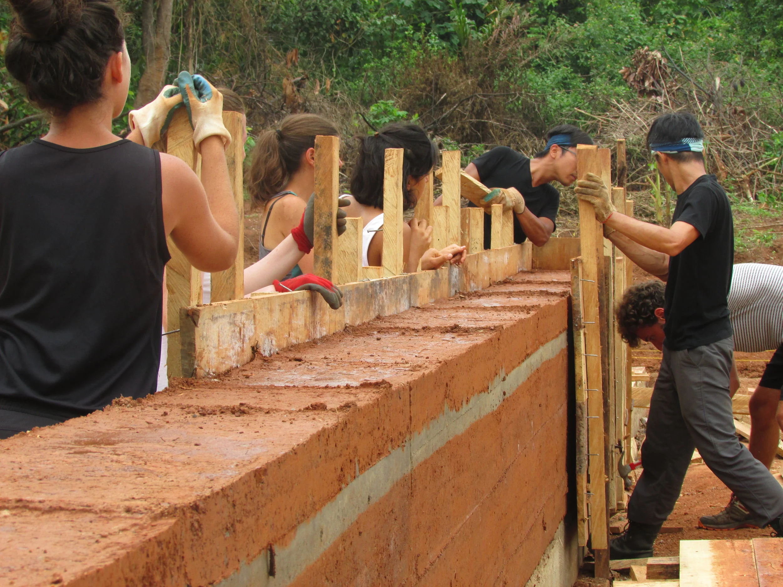 Since no electricity was available it was built by hand, crafting materials available on site (earth, wood and vegetation), moving by hand 58 000 kg of soil and planing 3km of wood with 2 hand planers. The lack of resources and the site limitations become the opportunity to propose a sustainable design that merges architecture and landscape: the staggered walls of the classrooms are built by compacting the local earth, a light wood structure lifts the roof up, allowing zenithal light into the building, and generates a natural ventilation of the spaces, while the vegetation of the garden becomes the continuation of the porches, increasing the shaded spaces to study outdoor.